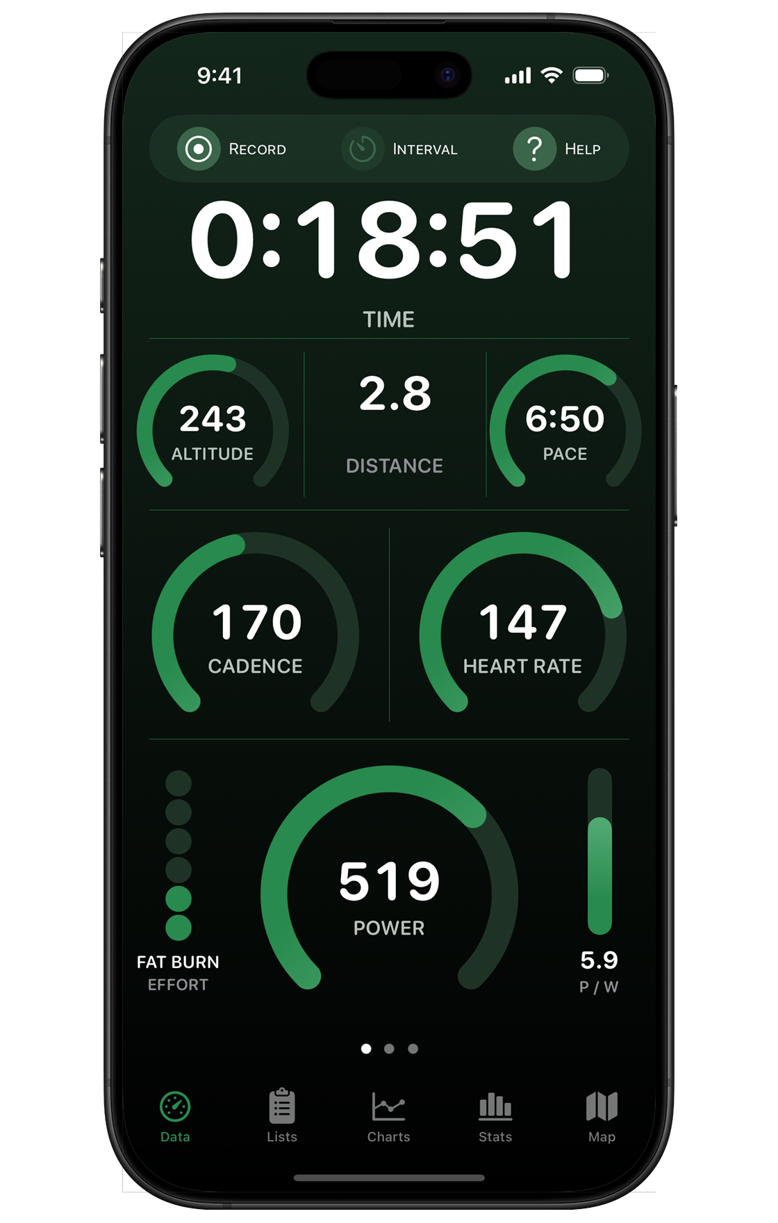All the data you could ever want displayed in an interface designed for outdoor runs in bright sunshine! Maximally sized white text is contrast on a black screen for optimal visibility in bright sunshine and excellent visibility through polarized sunglasses.