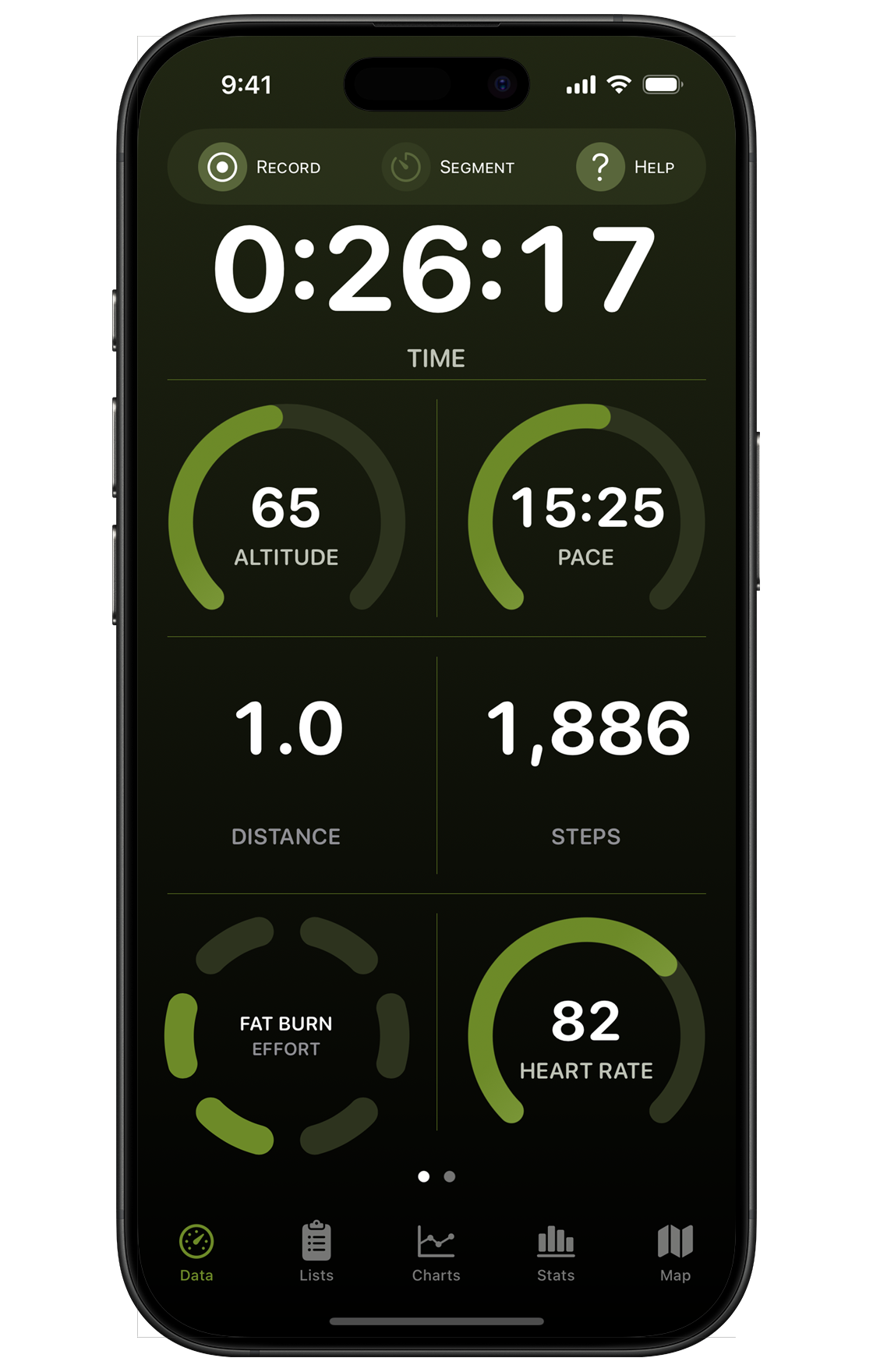 All the data you could ever want displayed in an interface designed for walks in bright sunshine! Maximally sized white text is contrast on a black screen for optimal visibility in bright sunshine and excellent visibility through dark sunglasses.